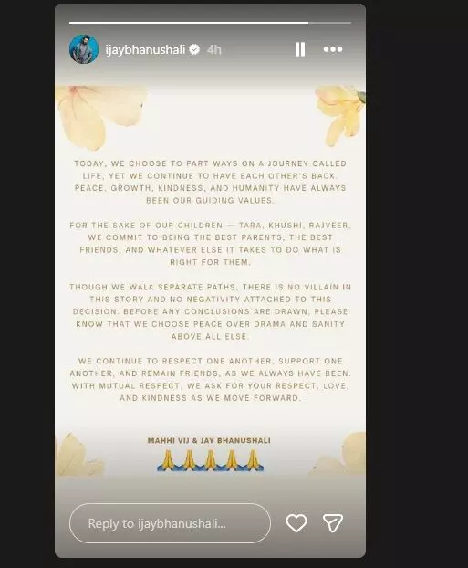 4 जनवरी को जय भानुशाली ने अपने इंस्टाग्राम अकाउंट पर एक लंबा नोट शेयर करते हुए इस फैसले की जानकारी दी। इस नोट में जय और माही ने लिखा कि उन्होंने ज़िंदगी के इस पड़ाव पर अलग रास्ते चुनने का निर्णय लिया है, लेकिन एक-दूसरे के प्रति सम्मान और सहयोग हमेशा बना रहेगा। उन्होंने कहा कि उनकी सबसे बड़ी प्राथमिकता उनके बच्चे हैं और उनके लिए वे हमेशा एक टीम की तरह काम करेंगे।