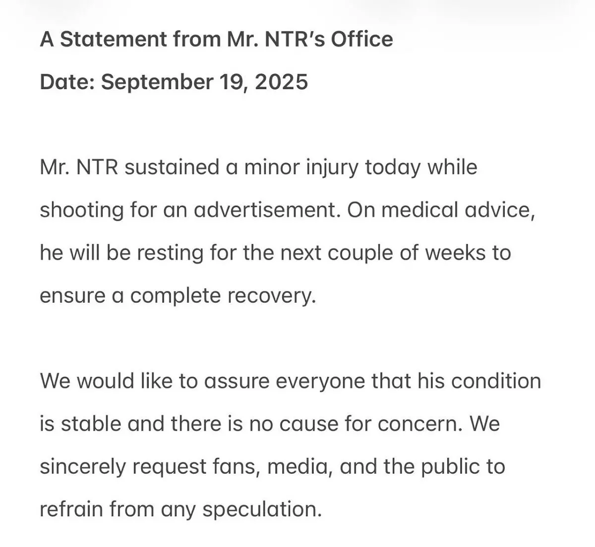 एक्टर की टीम की ओर से जारी बयान में कहा गया, "मिस्टर एनटीआर को एक विज्ञापन की शूटिंग के दौरान मामूली चोट लगी है। डॉक्टरों की सलाह पर वह अगले कुछ हफ्तों तक आराम करेंगे ताकि पूरी तरह से स्वस्थ हो सकें। हम सभी को यह बताना चाहते हैं कि उनकी हालत स्थिर है और घबराने की कोई बात नहीं है। हम सभी फैंस, मीडिया और पब्लिक से अनुरोध करते हैं कि किसी भी तरह की अटकलें न लगाएं।"