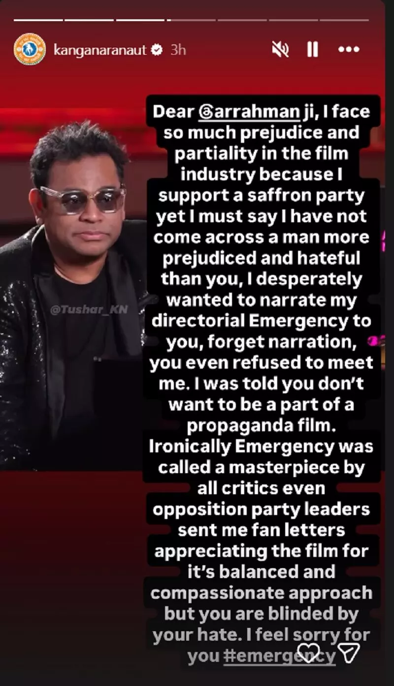 कंगना रनौत ने अपनी इंस्टाग्राम स्टोरी पर एआर रहमान के एक इंटरव्यू का स्क्रीनशॉट साझा किया और उनके खिलाफ खुलकर अपनी नाराजगी जाहिर की। कंगना ने लिखा कि उन्हें फिल्म इंडस्ट्री में अपने राजनीतिक विचारों की वजह से पहले ही भेदभाव का सामना करना पड़ता है, लेकिन एआर रहमान जैसा पहले से भरी नफरत उन्होंने किसी में नहीं देखी।