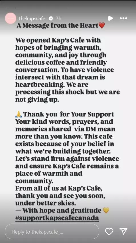बयान में आगे कहा गया, "आपके भेजे गए संदेश, दुआएं और साझा की गई यादें हमारे लिए बहुत मायने रखती हैं। यह कैफे आप सभी के विश्वास से खड़ा है। आइए हम हिंसा के खिलाफ एकजुट हों और सुनिश्चित करें कि कप्स कैफे फिर से एक प्यार और समुदाय की जगह बना रहे। हम जल्द मिलेंगे, बेहतर आसमानों के नीचे।"