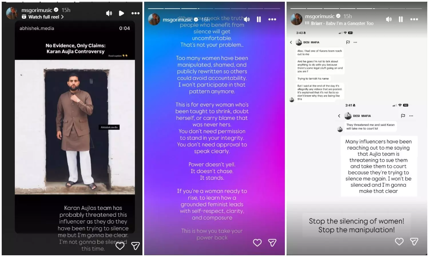 इसके बाद Ms Gori ने लगातार कई इंस्टाग्राम स्टोरीज़ साझा कीं। एक पोस्ट में उन्होंने दावा किया कि कई इंफ्लुएंसर्स ने उनसे संपर्क किया और बताया कि उन्हें भी कथित तौर पर करण औजला और उनकी टीम की ओर से दबाव में रखा जा रहा है।