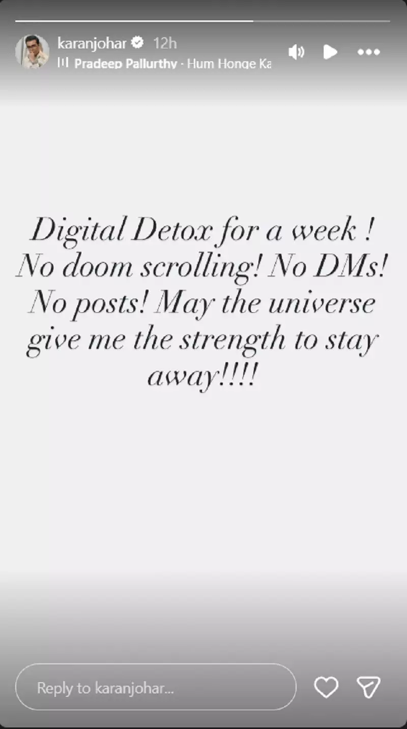 करण जौहर ने अपनी स्टोरी में लिखा, “एक हफ्ते का डिजिटल डिटॉक्स! ना डूम स्क्रॉलिंग, ना डीएम्स और ना ही पोस्ट! यूनिवर्स मुझे इससे दूर रहने की ताकत दे।” उनका यह संदेश तेजी से चर्चा में आ गया।