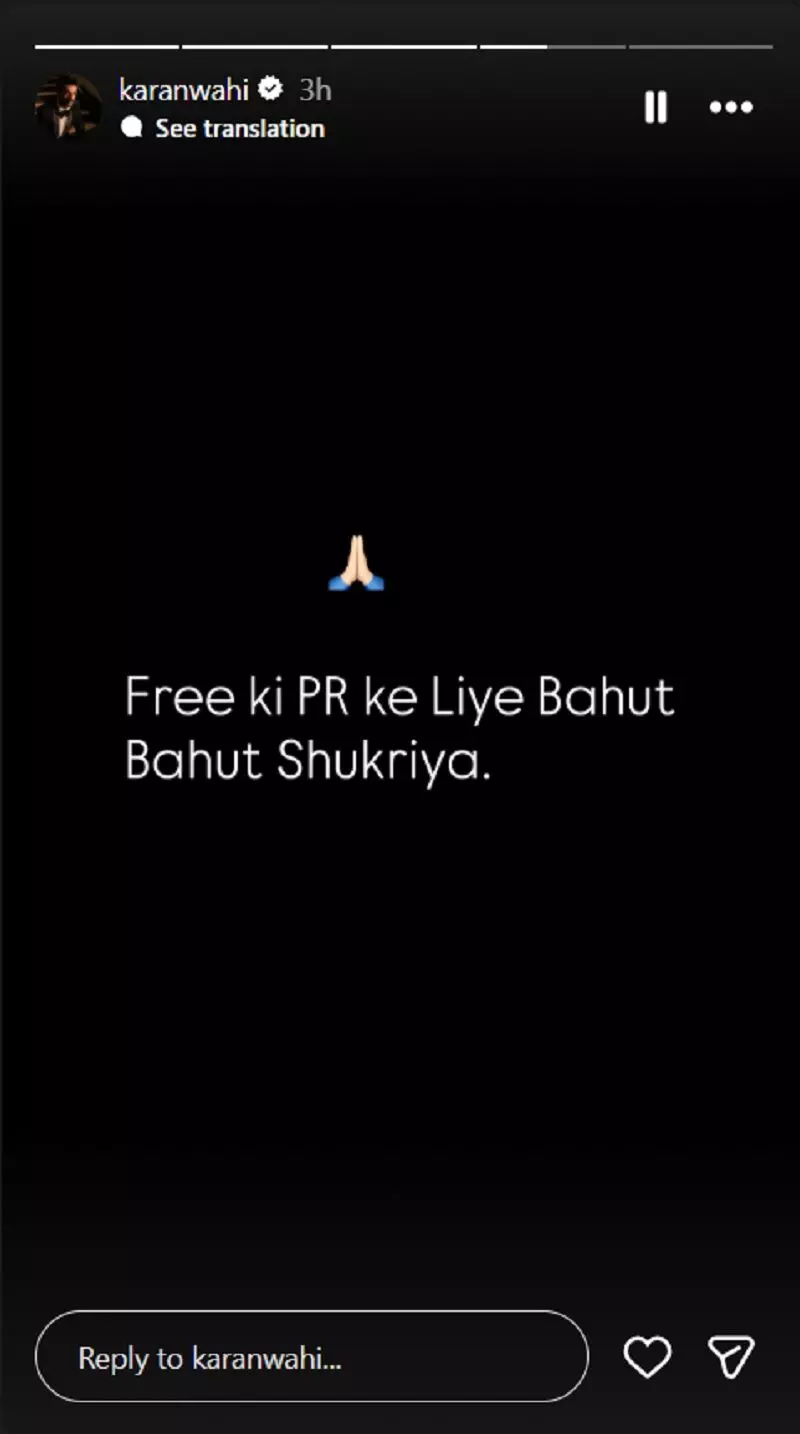 इसपर प्रतिक्रिया देते हुए करण ने अपने इंस्टाग्राम स्टोरी पर इन अफवाहों को फैलाने वालों के लिए लिखा, "मुफ्त के पीआर के लिए बहुत-बहुत शुक्रिया।"