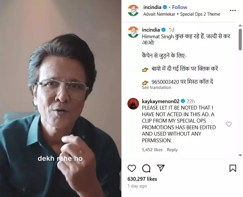 केके मेनन ने इंस्टाग्राम पर कांग्रेस के किए गए एक वीडियो पर प्रतिक्रिया दी।