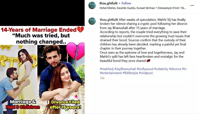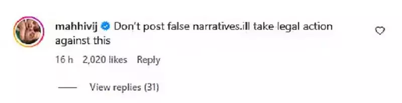 दरअसल, thou.ghtful6 नाम के एक इंस्टाग्राम पेज ने यह दावा किया था कि जय और माही ने अपने रिश्ते को बचाने की काफी कोशिश की, लेकिन उनके बीच “ट्रस्ट इश्यूज़” के कारण वे अलग हो गए। इस पोस्ट पर माही विज ने कमेंट करते हुए लिखा- “गलत बातें मत फैलाइए। अगर ऐसा जारी रहा तो मैं कानूनी कार्रवाई करूंगी।”