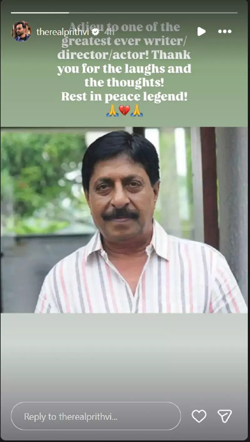 उनके निधन की खबर सामने आते ही कई फिल्मी हस्तियों ने शोक व्यक्त किया। अभिनेता पृथ्वीराज सुकुमारन ने सोशल मीडिया पर उन्हें भारतीय सिनेमा के सबसे बेहतरीन कलाकारों में से एक बताते हुए अंतिम विदाई दी। एक्टर कमल हासन और शशि थरूर ने भी शोक जताया है।
