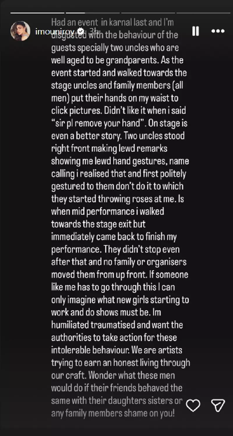 शनिवार को मौनी ने अपने इंस्टाग्राम स्टोरी में लिखा कि करनाल इवेंट में दो ‘अनकल्स’ ने उनके कमर पर हाथ रखा और तस्वीरें खींचने की कोशिश की। मौनी ने उन्हें विनम्रता से हटाने के लिए कहा, लेकिन उनका व्यवहार नहीं बदला।