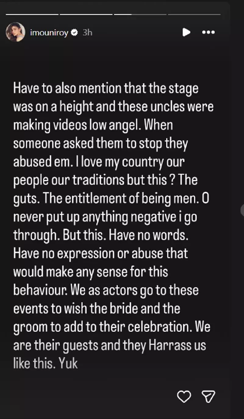 मौनी ने कहा, "हम उनके इवेंट्स में मेहमान के रूप में जाते हैं, दूल्हा-दुल्हन को शुभकामनाएं देने, और फिर हम इस तरह उत्पीड़ित होते हैं। यह बिलकुल असहनीय है।"