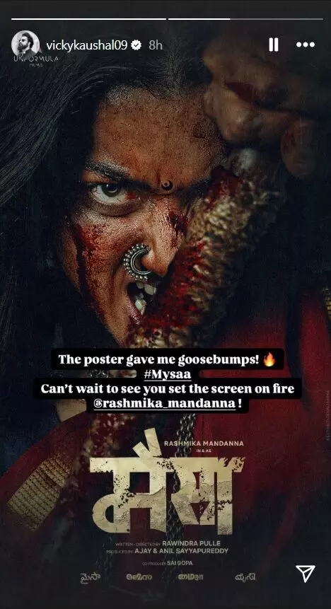 रश्मिका के 'छावा' को-स्टार विक्की कौशल भी उनके इस नए लुक से काफी प्रभावित हुए हैं। उन्होंने अपनी इंस्टा स्टोरी पर मायसा का पोस्टर शेयर करते हुए लिखा- "इस पोस्टर ने रोंगटे खड़े कर दिए! स्क्रीन पर तुम्हें आग लगाते देखने का अब इंतजार नहीं हो रहा।"