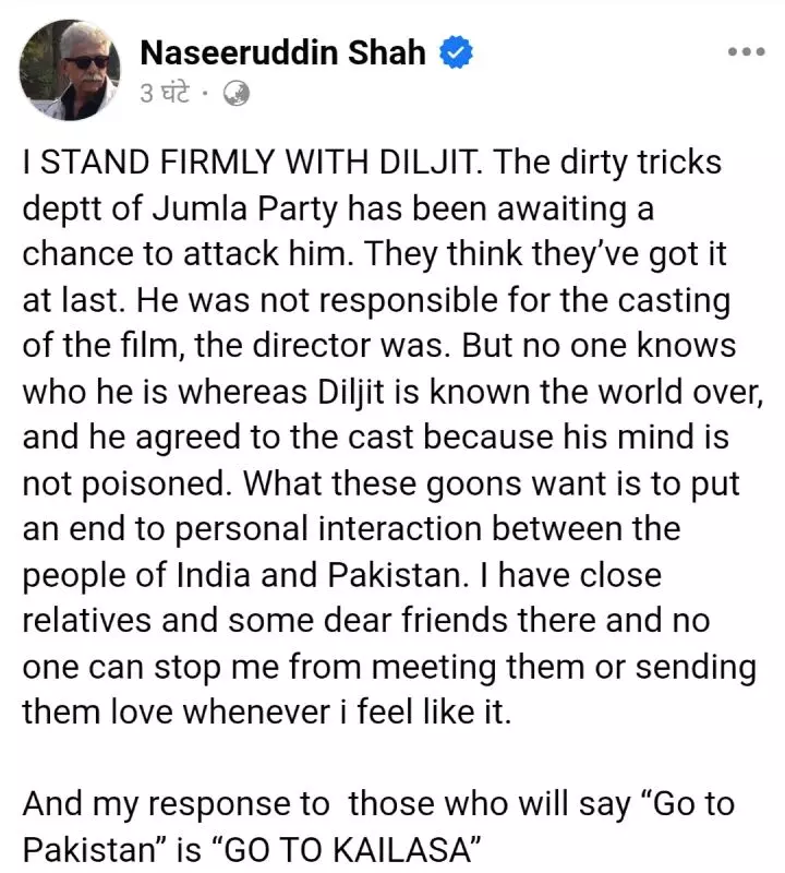 हाल ही में नसीरुद्दीन शाह ने अपने फेसबुक पर एक नोट शेयर किया, जिसमें उन्होंने लिखा, “मैं दिलजीत के साथ मजबूती से खड़ा हूं। जुमला पार्टी का गंदा काम करने वाला विभाग उस पर हमला करने का मौका तलाश रहा है। उन्हें लगता है कि आखिरकार उन्हें मौका मिल ही गया। फिल्म की कास्टिंग के लिए वह जिम्मेदार नहीं था, निर्देशक जिम्मेदार था। लेकिन कोई नहीं जानता कि वह कौन है, जबकि दिलजीत को पूरी दुनिया जानती है और उसने कास्ट के लिए इसलिए हामी भरी क्योंकि उसके दिमाग में जहर नहीं भरा है।
