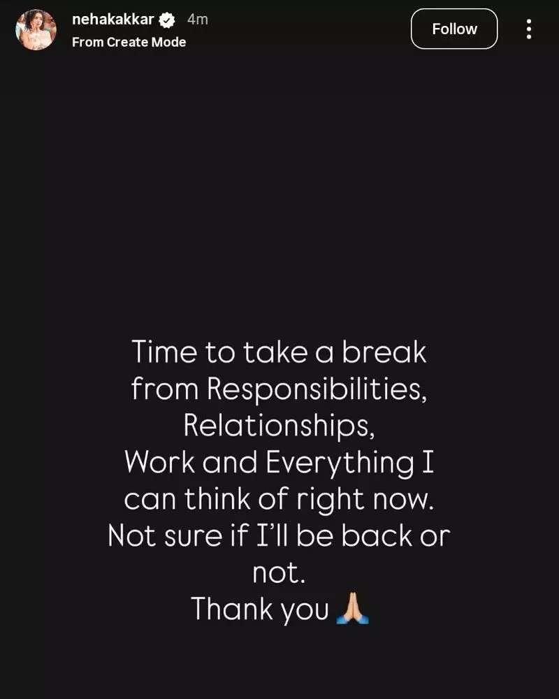 सोमवार को नेहा ने इंस्टाग्राम स्टोरीज़ में लिखा: "अब जिम्मेदारियों, रिश्तों, काम और हर चीज़ से ब्रेक लेने का समय है। मुझे नहीं पता कि मैं वापस आऊंगी या नहीं। धन्यवाद।"