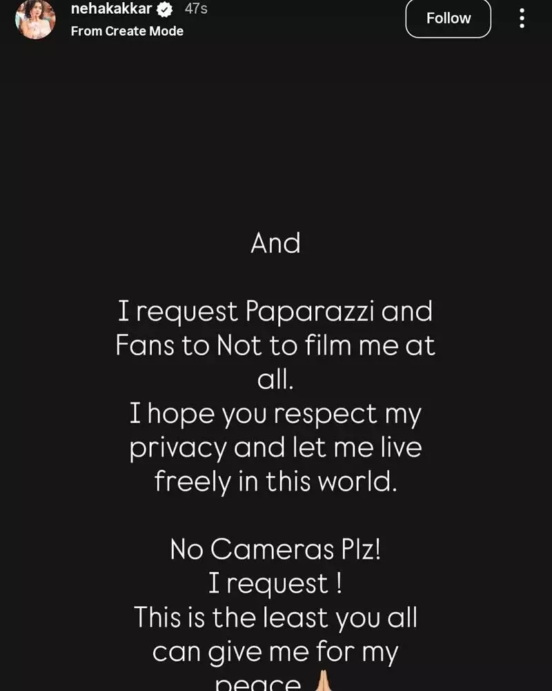 इसके अलावा, उन्होंने पैपराज़ी और फैंस से भी विनती की कि उन्हें किसी भी तरह से कैमरे में कैप्चर न करें। नेहा ने लिखा: "मैं पैपराज़ी और फैंस से अनुरोध करती हूं कि मुझे बिलकुल भी फिल्म न करें। मेरी प्राइवेसी का सम्मान करें और मुझे दुनिया में स्वतंत्र रूप से जीने दें। कोई कैमरा नहीं, प्लीज! यह कम से कम चीज़ है जो आप मेरी शांति के लिए दे सकते हैं।"
