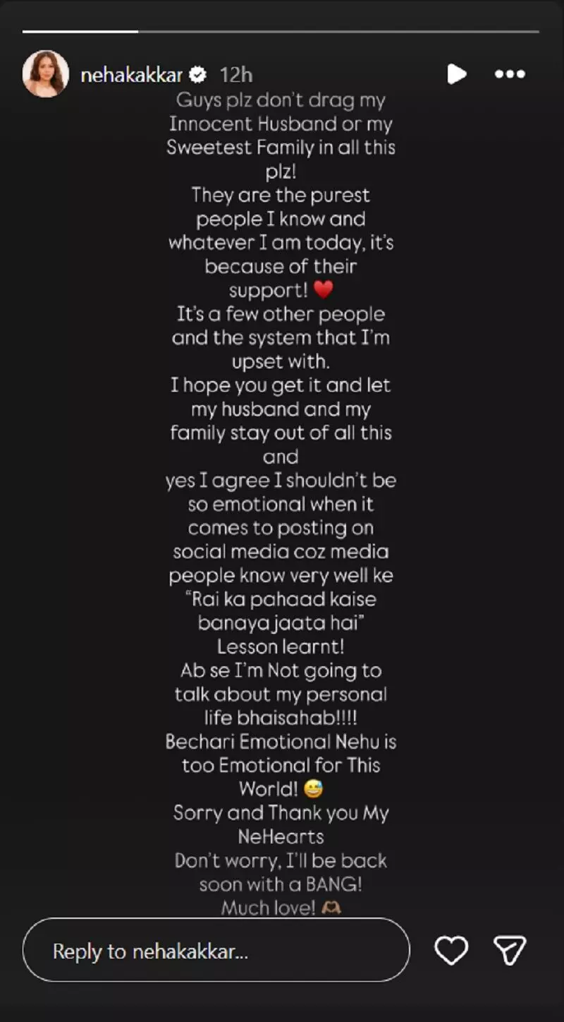 नेहा ने सोमवार को एक लंबा स्पष्टीकरण जारी किया। उन्होंने लिखा, "प्लीज़ मेरे मासूम पति और मेरे प्यारे परिवार को इस सब में मत घसीटो। वे दुनिया के सबसे अच्छे लोग हैं और मैं आज जो कुछ भी हूं, उनके सपोर्ट की वजह से हूं।"