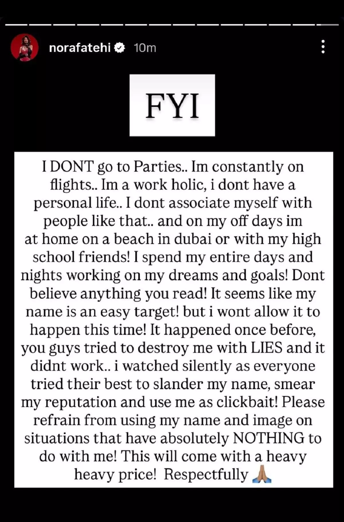 इन खबरों पर नोरा फतेही ने इंस्टाग्राम स्टोरीज़ के ज़रिए सख्त नाराज़गी जताते हुए इन्हें 'झूठ' बताया और कहा कि वह ऐसी पार्टियों में शामिल ही नहीं होतीं।