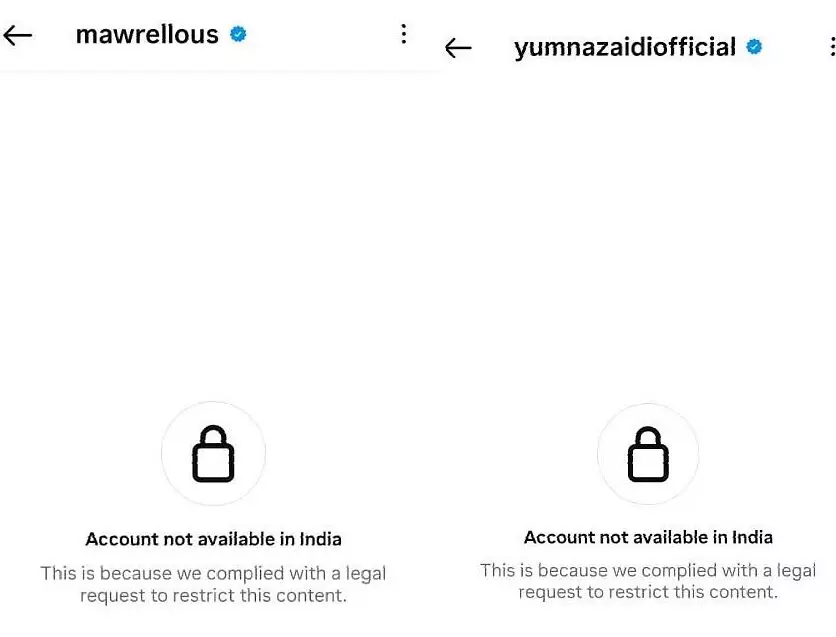 इन अकाउंट्स को खोलने की कोशिश करने पर यूज़र्स को एक स्टैंडर्ड नोटिफिकेशन दिखाई दे रहा है: "यह अकाउंट भारत में उपलब्ध नहीं है। हमने एक कानूनी अनुरोध के अनुसार इस सामग्री को प्रतिबंधित किया है।"