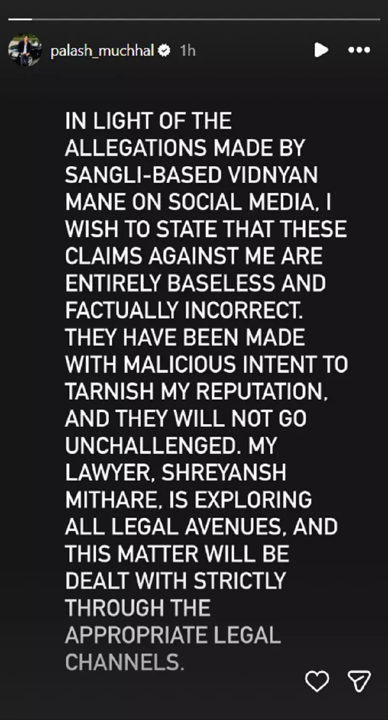 पलाश ने कहा, “संगली के विद्यान माने द्वारा सोशल मीडिया पर लगाए गए आरोपों के संदर्भ में मैं स्पष्ट करना चाहता हूं कि मेरे खिलाफ ये दावे पूरी तरह से बिना आधार के और तथ्यात्मक रूप से गलत हैं। मेरे वकील श्रेयांश मिथारे इस मामले में सभी कानूनी रास्तों का पालन कर रहे हैं और इस मामले को उचित कानूनी चैनलों के माध्यम से सख्ती से निपटाया जाएगा।”