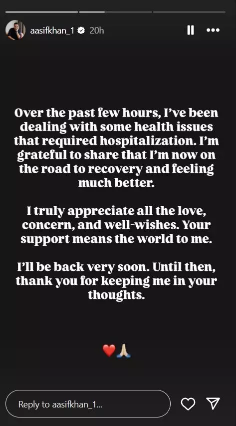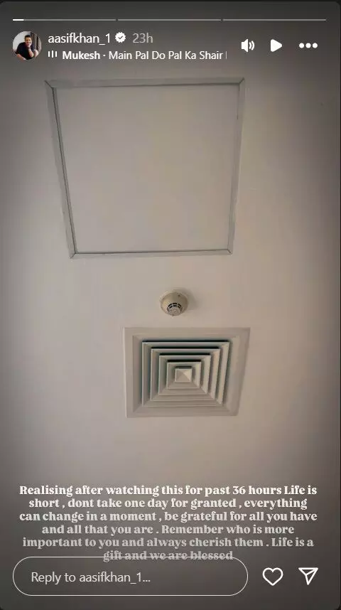 मंगलवार को आसिफ खान ने अपनी इंस्टाग्राम स्टोरी में अस्पताल से एक तस्वीर शेयर की और लिखा- "पिछले 36 घंटों में ये सब देखकर एक बात समझ में आई – जिंदगी बहुत छोटी है। किसी भी दिन को हल्के में मत लो। सब कुछ एक पल में बदल सकता है। जो कुछ भी आपके पास है, उसके लिए आभारी रहो और अपने अपनों को कभी न भूलो। जिंदगी एक तोहफा है और हम सभी सौभाग्यशाली हैं।”