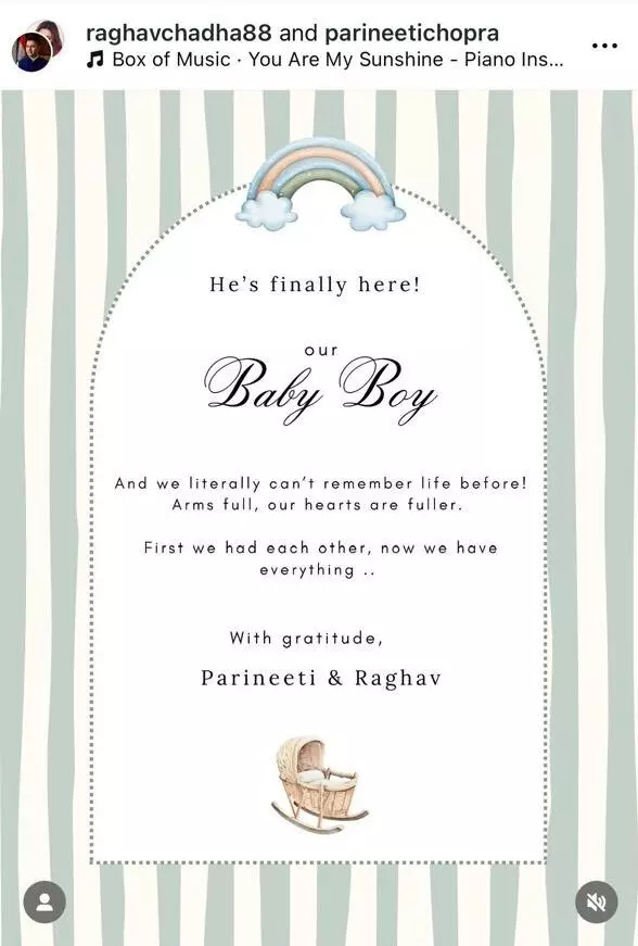 परिणीति ने अपने पोस्ट में लिखा – “वह आ गया है! हमारा छोटा सितारा हमारे जीवन में आ चुका है। अब पुरानी जिंदगी एक सपने जैसी लगती है। हमारी बाहें भरी हैं और दिल खुशी से लबरेज है। पहले हम एक-दूसरे के थे, अब हमारा सब कुछ है।”