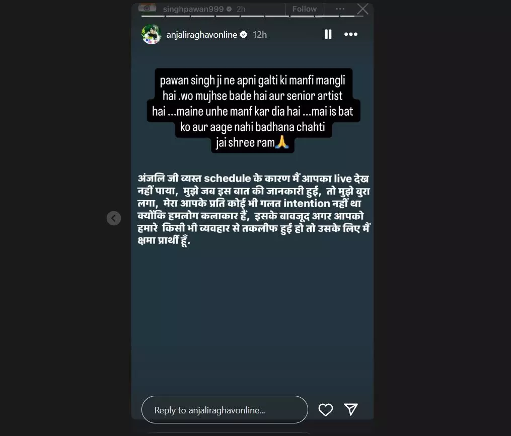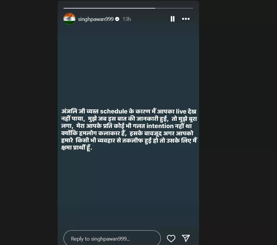 पवन सिंह ने इंस्टाग्राम स्टोरी के जरिए माफी मांगते हुए कहा कि उनका अंजलि के प्रति कोई “गलत इरादा” नहीं था। उन्होंने हिंदी में लिखा: “अंजलि जी, व्यस्त शेड्यूल के कारण मैं आपका लाइव देख नहीं पाया। मुझे जब इस बात की जानकारी हुई, तो मुझे बुरा लगा। मेरा आपके प्रति कोई भी गलत इरादा नहीं था क्योंकि हम लोग कलाकार हैं। इसके बावजूद, अगर आपको हमारी किसी भी व्यवहार से तकलीफ हुई हो तो उसके लिए मैं क्षमा प्रार्थी हूं।”