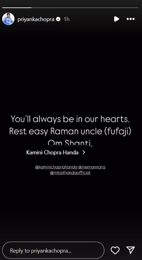 प्रियंका चोपड़ा ने मंगलवार को अपने इंस्टाग्राम स्टोरी पर लिखा- 'आप हमेशा हमारे दिल में बसे रहेंगे फूफा जी, उनकी आत्मा को शांति मिले।' इसी के साथ एक्ट्रेस ने बहन मनारा और उनकी मां वह छोटी बहन को भी टैग किया है।