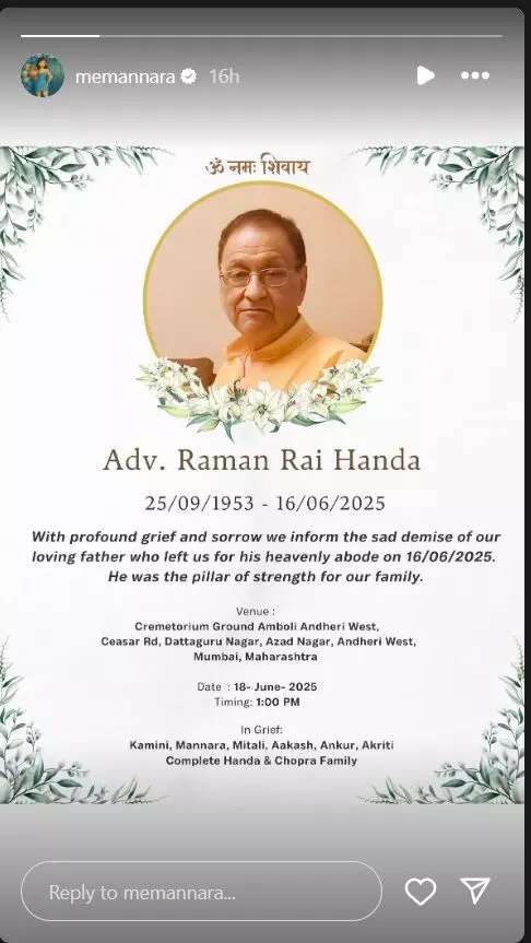 Mannara Chopra father dies: अभिनेत्री प्रियंका चोपड़ा और परिणीति चोपड़ा की कजिन बहन मन्नारा चोपड़ा को गहरा सदमा पहुंचा है। बिग बॉस फेम मनारा चोपड़ा के पिता रमण राय हांडा का 16 जून 2025 को 72 वर्ष की आयु में निधन हो गया। इस दुखद खबर की जानकारी मन्नारा ने अपने सोशल मीडिया अकाउंट पर साझा की और अंतिम संस्कार से जुड़ी जानकारी भी दी। इसी बीच प्रियंका को भी अपने फूफा के निधन से गहरा सदमा लगा है। उन्होंने शोक जताते हुए मनारा और उनकी फैमिली को दिलासा दिया।