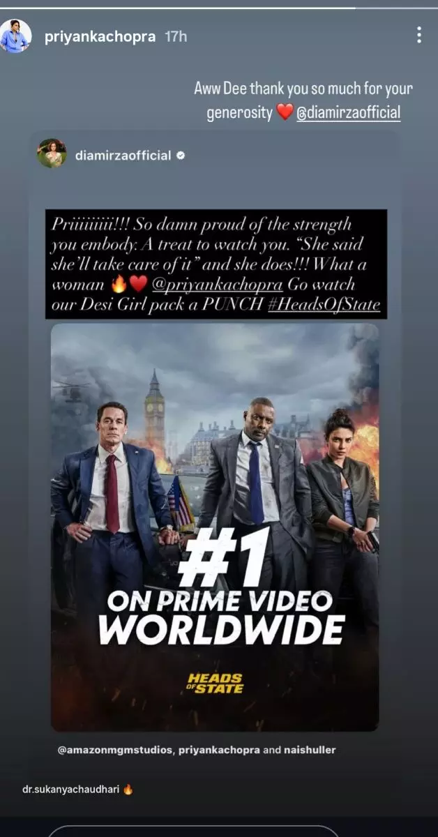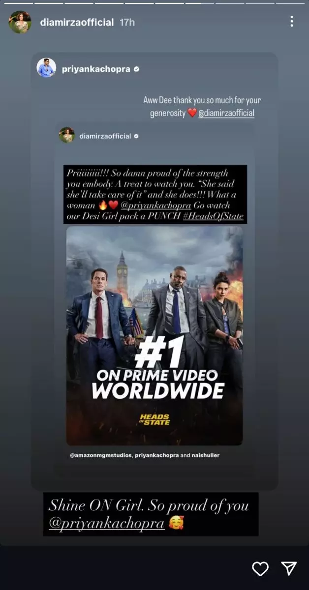 Priyanka Chopra: प्रियंका चोपड़ा की एक्शन-थ्रिलर फिल्म 'हेड्स ऑफ़ स्टेट' को दर्शकों से भरपूर प्यार मिल रहा है। अब फिल्म को लेकर अभिनेत्री दिया मिर्जा ने प्रियंका की परफॉर्मेंस की तारीफ की और सोशल मीडिया पर एक खास नोट शेयर कर उनका हौसला भी बढ़ाया।
