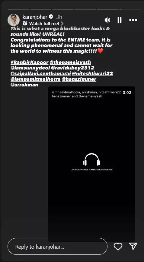 फिल्ममेकर करण जौहर ने रणबीर कपूर, यश समेत पूरी फिल्म की टीम को बधाई देते हुए इंस्टाग्राम स्टोरी पर लिखा- "यह एक मेगा ब्लॉकबस्टर की तरह दिखती और सुनाई देती है! अविश्वसनीय! पूरी टीम को बधाई, यह अद्भुत लग रहा है और हम दुनिया को इस जादू को देखने के लिए इंतजार नहीं कर सकते!"