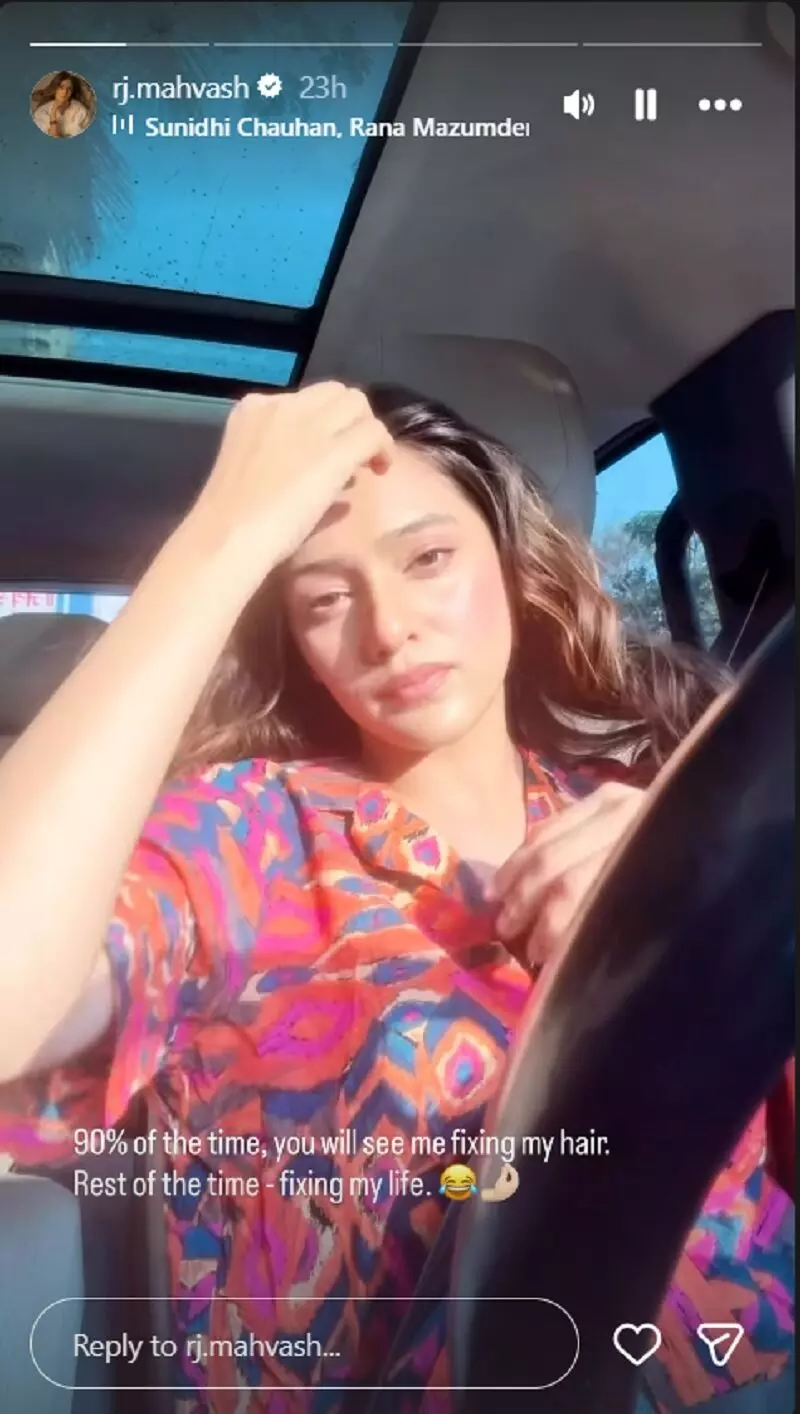 शुक्रवार को महवश ने इंस्टाग्राम स्टोरी पर एक छोटा सा वीडियो शेयर किया, जिसमें वह अपनी कार में बैठी नजर आ रही हैं और हल्के-फुल्के अंदाज़ में अपने बाल ठीक कर रही हैं। हालांकि वीडियो के साथ लिखा कैप्शन लोगों का ध्यान खींच ले गया। महवश ने लिखा, “90% समय आप मुझे अपने बाल ठीक करते देखेंगे, बाकी समय - अपनी ज़िंदगी।”