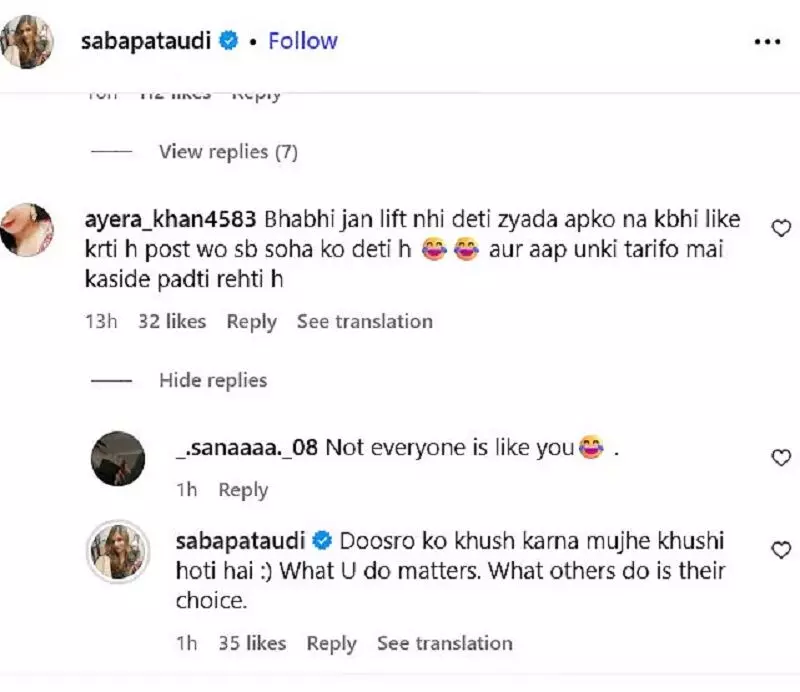 इसपर एक यूजप ने कमेंट किया- भाभीजान लिफ्ट नहीं देती आपको.. ना कभी पोस्ट लाइक करती हैं.. वो सब सोहा के लिए करती हैं और आप उनकी तारीफों में कसीदें पढ़ती रहती हैं। इस कमेंट पर सबा ने बहुत ही संजीदगी और शालीनता से जवाब दिया।