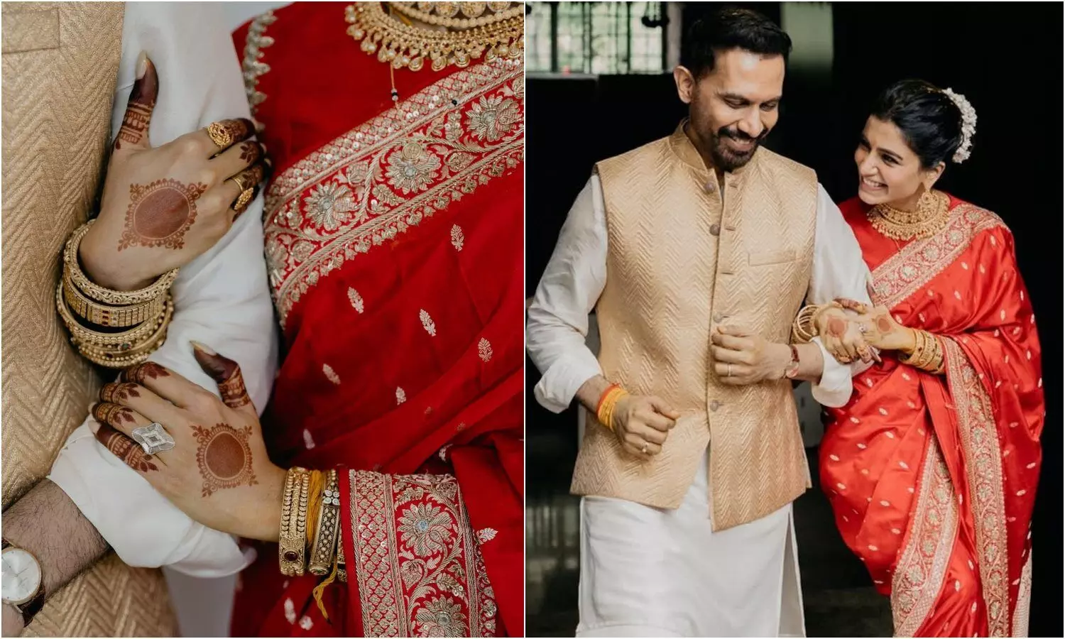 सामंथा ने अपनी शादी के दिन लाल साड़ी, सोने के गहने और सफेद फूलों से सजे बाल में बेहद खूबसूरत लग रही थीं। उन्होंने अपनी उंगली में काइट‑शेप वाली अंगूठी, मांगलसूत्र और मेहंदी भी दिखाई, जो उनके पारंपरिक और सादगीभरे अंदाज को दिखाता है।