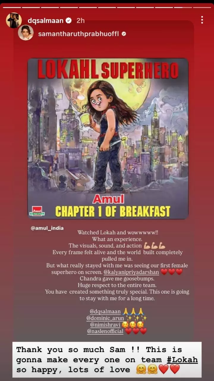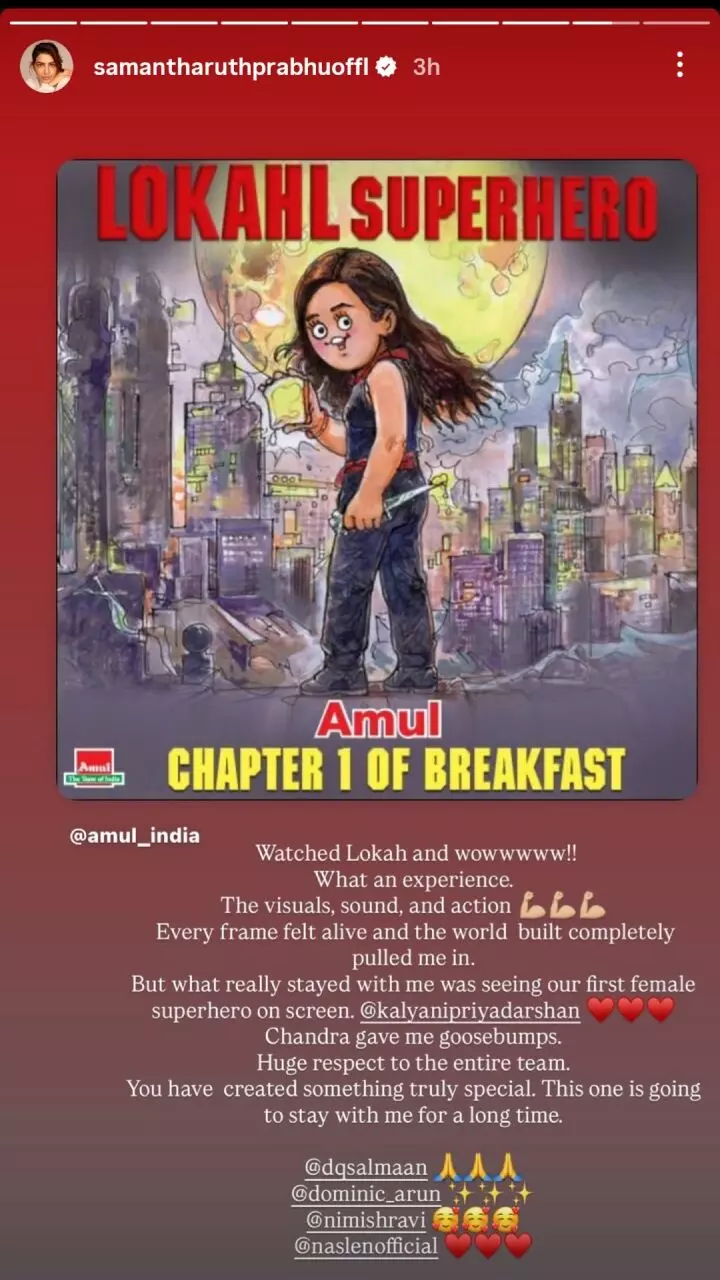 सामंथा ने अपनी इंस्टा स्टोरी पर लिखा, “लोका देखी और वाह! हर फ्रेम ने मुझे चौंकाया। विजुअल्स, साउंड और एक्शन कमाल के थे। लेकिन सबसे खास पल वह था जब हमारी पहली महिला सुपरहीरो चंद्रा स्क्रीन पर उतरीं। कल्याणी प्रियदर्शन का परफॉर्मेंस अद्भुत है। पूरी टीम को दिल से बधाई।”