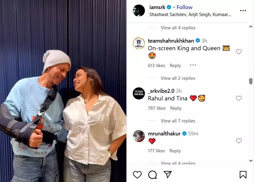 शाहरुख और रानी की जोड़ी फैंस को हमेशा से पसंद आई है। ‘कुछ कुछ होता है’, ‘चलते चलते’, ‘कभी खुशी कभी गम’, ‘वीर ज़ारा’ और ‘पहेली’ जैसी फिल्मों में खूब पसंद किया है। इस नए वीडियो ने दर्शकों को उनकी पुरानी केमिस्ट्री की याद दिला दी। एक यूजर ने कमेंट किया, "राहुल और टीना एक पैरालल यूनिवर्स में फिर से मिल गए हैं।" वहीं किसी ने लिखा, "ऐसी जोड़ी फिर कहां!"