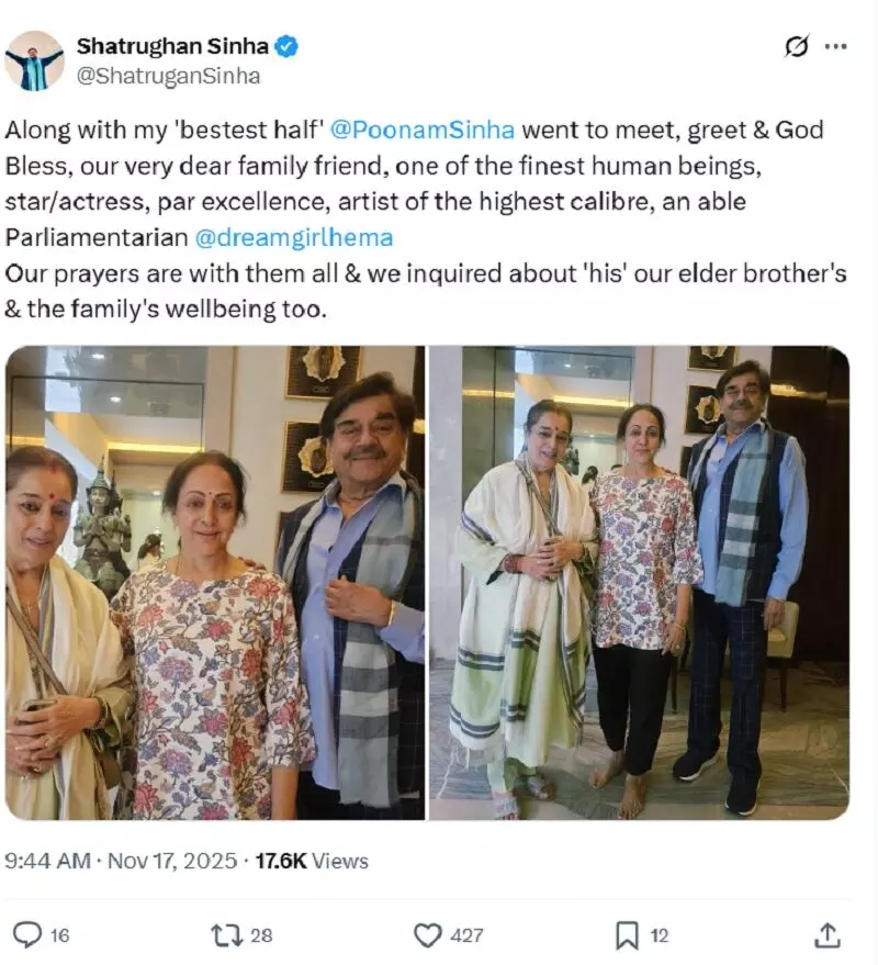 उन्होंने लिखा, “अपनी ‘बेस्टेस्ट हाफ’ पूनम सिन्हा के साथ हम अपनी प्रिय मित्र, बेहतरीन इंसान, शानदार अभिनेत्री और सक्षम सांसद हेमा मालिनी से मिलने और उनका हालचाल जानने गए।” आगे उन्होंने लिखा, “हमारी दुआएं हमेशा उनके साथ हैं। हमने 'उनके', अपने 'बड़े भाई' और पूरे परिवार का हालचाल जाना।"
