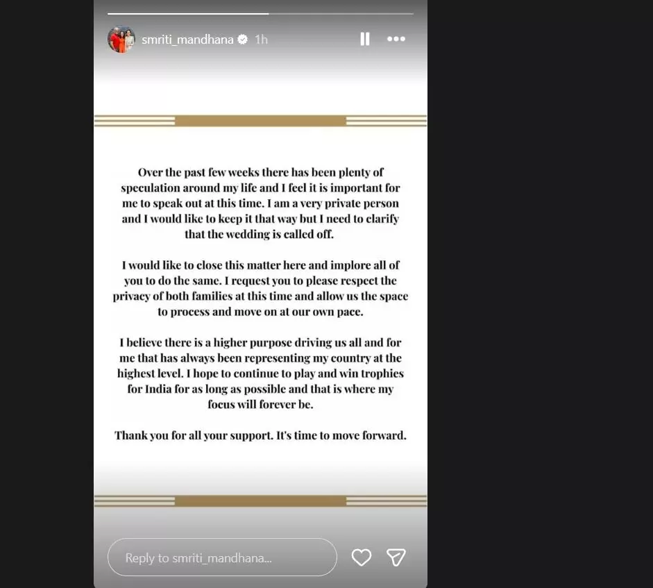 रविवार को इंस्टाग्राम स्टोरी के जरिए मंधाना ने लिखा कि पिछले कुछ हफ्तों से उनके निजी जीवन पर कई तरह की अफवाहें फैल रही हैं, इसलिए सच बताना जरूरी हो गया था। उन्होंने कहा, ''मैं बहुत निजी इंसान हूं और अपनी जिंदगी को इसी तरह रखना चाहती हूं, लेकिन यह स्पष्ट करना ज़रूरी है कि शादी रद्द हो चुकी है। मैं चाहती हूं कि यह मामला यहीं खत्म हो और दोनों परिवारों की निजता का सम्मान किया जाए। हमें अपनी गति से आगे बढ़ने का मौका दें।''
