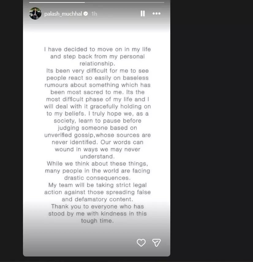 मंधाना की स्टोरी के बाद संगीतकार पलाश मुछाल ने भी अपना बयान साझा किया। उन्होंने कहा कि लगातार फैलाई जा रही अफवाहों ने उन्हें भावनात्मक रूप से काफी प्रभावित किया है।