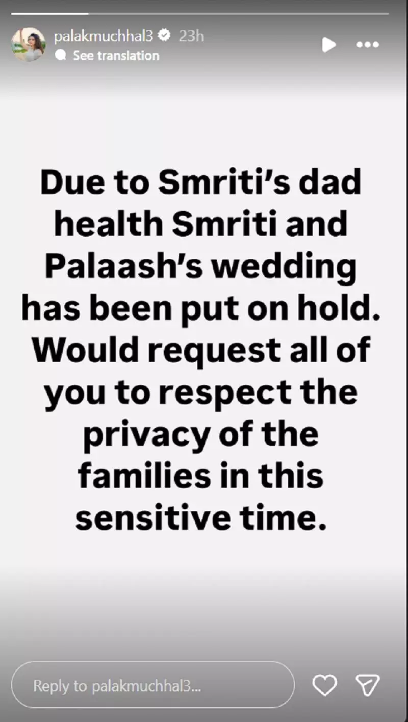 "स्मृति मंधाना के पिता की अचानक तबीयत बिगड़ने के कारण, स्मृति और पलाश की शादी फिलहाल के लिए टाल दी गई है। हम सभी से अनुरोध करते हैं कि इस मुश्किल घड़ी में हमाकी निजता का सम्मान किया जाए।"