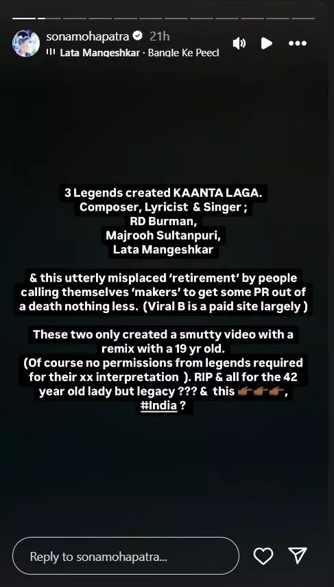 उन्होंने आगे लिखा, "बोल्ड और अश्लील एस्थेटिक वाले एक रीमिक्स वीडियो को बनाने से कोई असली निर्माता नहीं बन जाता। यह रचना का एक संस्करण था, पर इसकी आत्मा पुराने गीत में थी।" सोना ने यह भी कहा कि जब मूल गीत बनाने वाले कलाकारों से कभी सलाह या अनुमति नहीं ली गई, तो अब उनके नाम पर ‘कांटा लगा’ को रिटायर करना किस हद तक जायज़ है?