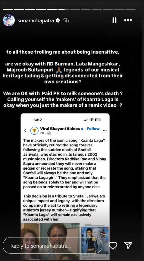 सोना मोहपात्रा ने सोशल मीडिया पर अपनी नाराजगी जाहिर की। उन्होंने अपने पोस्ट में लिखा, "RIP और सब कुछ उस 42 साल की महिला के लिए, लेकिन असली मुद्दा यह है कि क्या हम अपने म्यूज़िक लीजेंड्स को ऐसे ही भुला देंगे?"