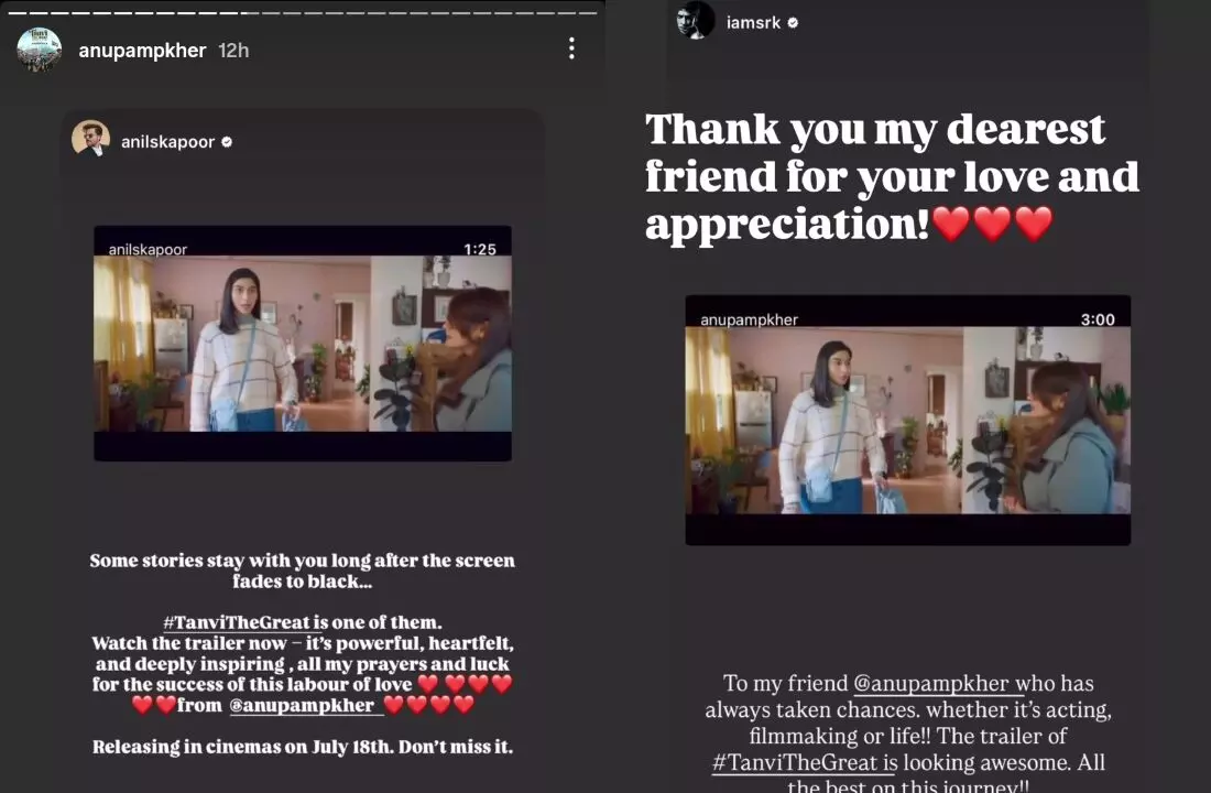 शाहरुख खान ने अपनी इंस्टाग्राम स्टोरी पर 'तन्वी द ग्रेट' का ट्रेलर शेयर करते हुए लिखा, "मेरे दोस्त अनुपम खेर के लिए, जिन्होंने हमेशा जोखिम उठाया है – चाहे वह अभिनय हो, फिल्म निर्माण हो या जीवन! ट्रेलर शानदार लग रहा है। इस नए सफर के लिए शुभकामनाएं!"
