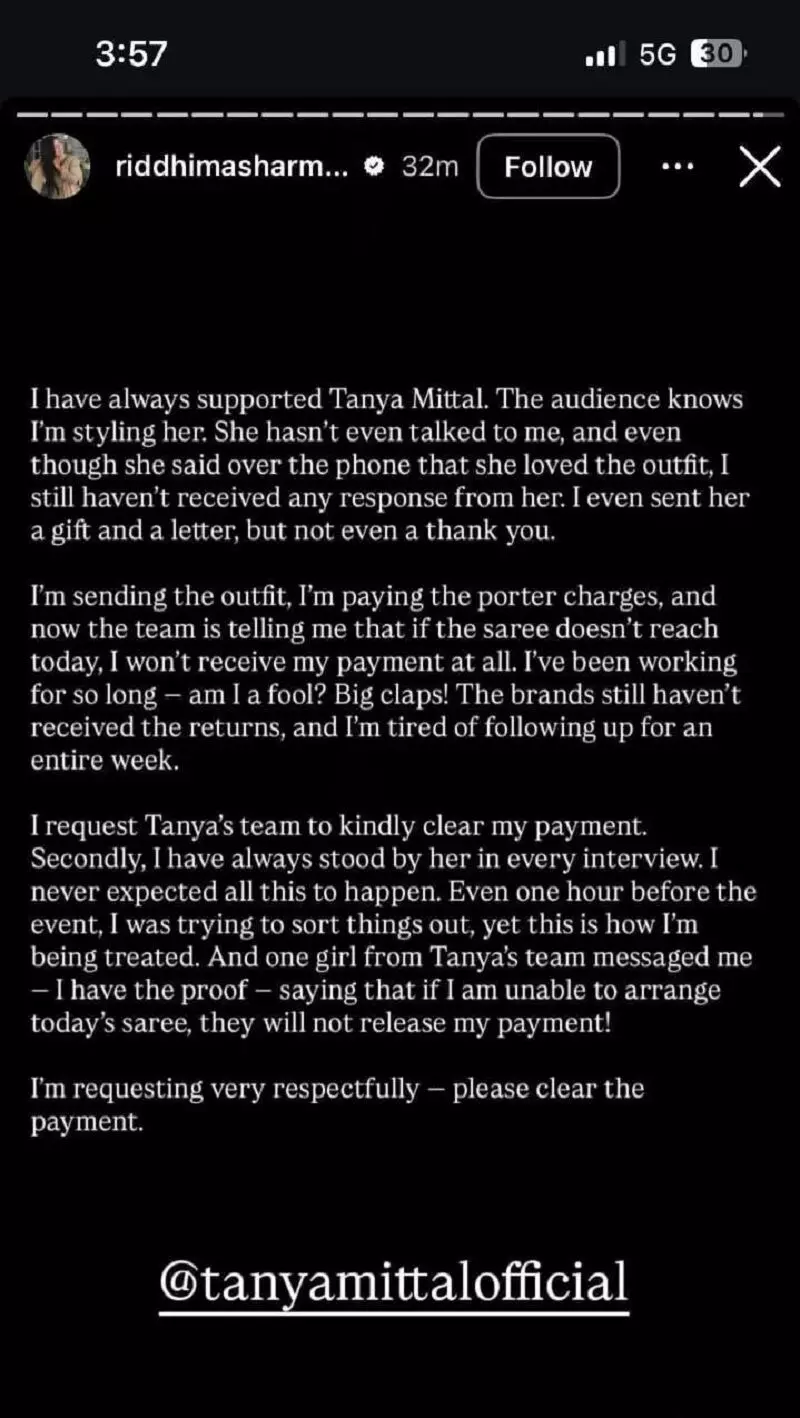 रिद्धिमा ने आगे खुलासा किया, “मैंने आउटफिट भेजा, पोर्टर चार्जेस भी मैं ही दे रही हूं। अब उनकी टीम बोल रही है कि अगर साड़ी आज नहीं पहुँची तो मुझे पेमेंट बिल्कुल नहीं मिलेगी। मैं इतने समय से काम कर रही हूं- क्या मैं बेवकूफ हूं?”
