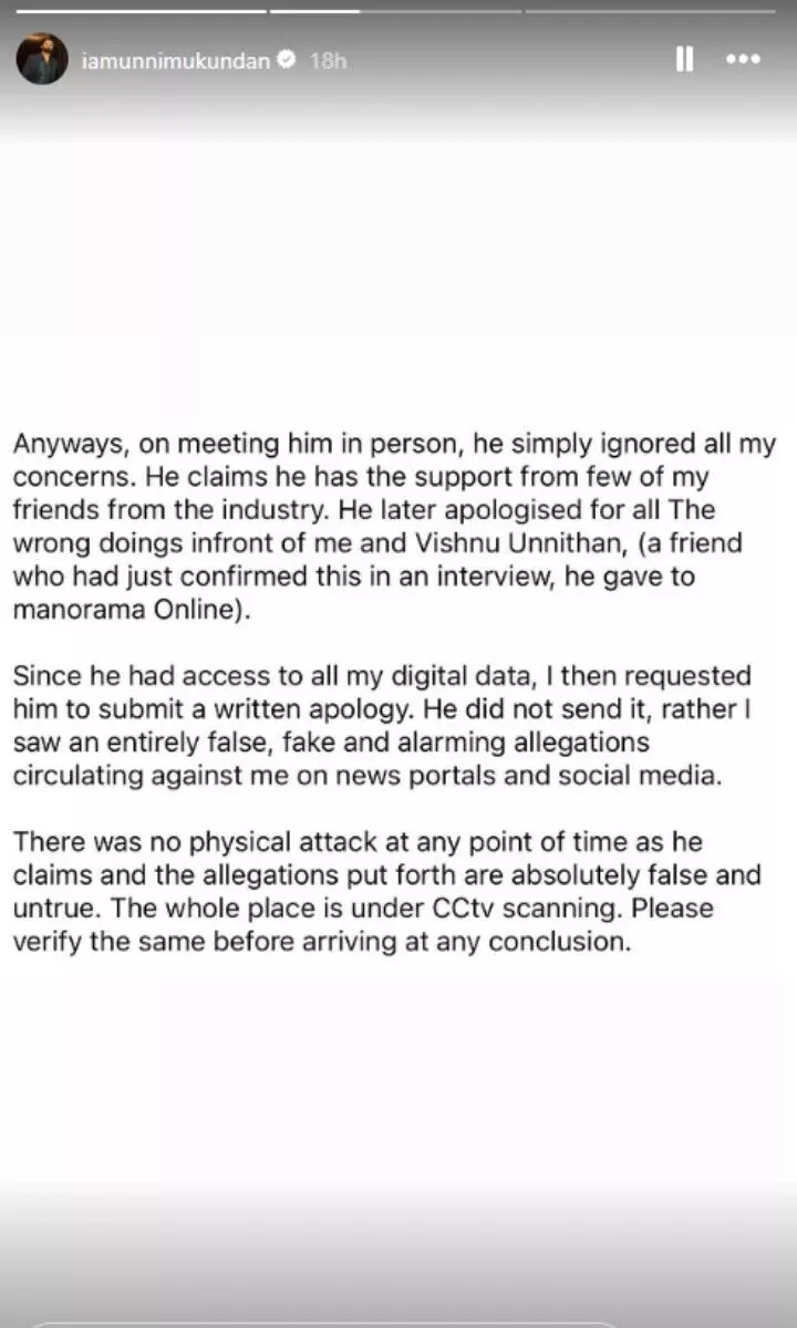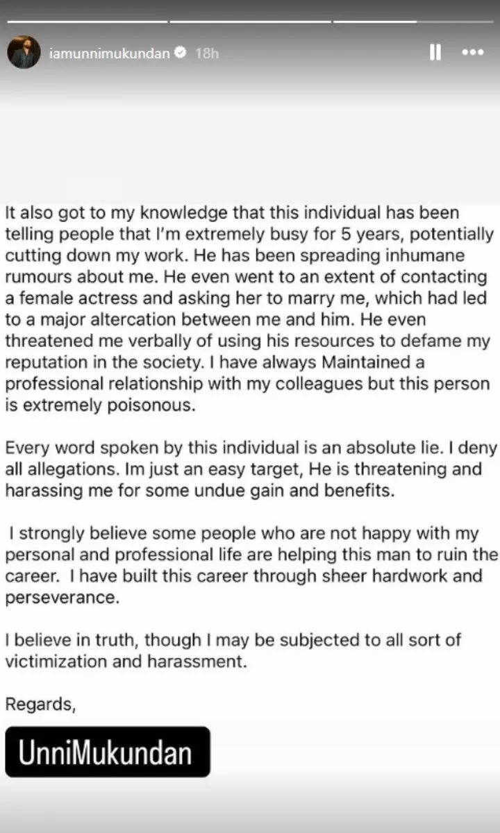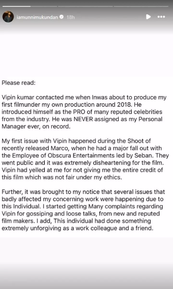 इस पूरे विवाद पर अपनी चुप्पी तोड़ते हुए, उन्नी मुकुंदन ने अपने इंस्टाग्राम पर स्टोरी शेयर कर लंबा नोट साझा किया। जिसमें उन्नी ने लिखा कि जब मैं 2018 में अपने प्रोडक्शन के तहत अपनी पहली फिल्म बनाने वाला था, तब विपिन कुमार ने मुझसे संपर्क किया। उन्होंने खुद को इंडस्ट्री की कई प्रतिष्ठित हस्तियों के पीआरओ के रूप में पेश किया। रिकॉर्ड के अनुसार, उन्हें कभी भी मेरा पर्सनल मैनेजर नहीं बनाया गया।