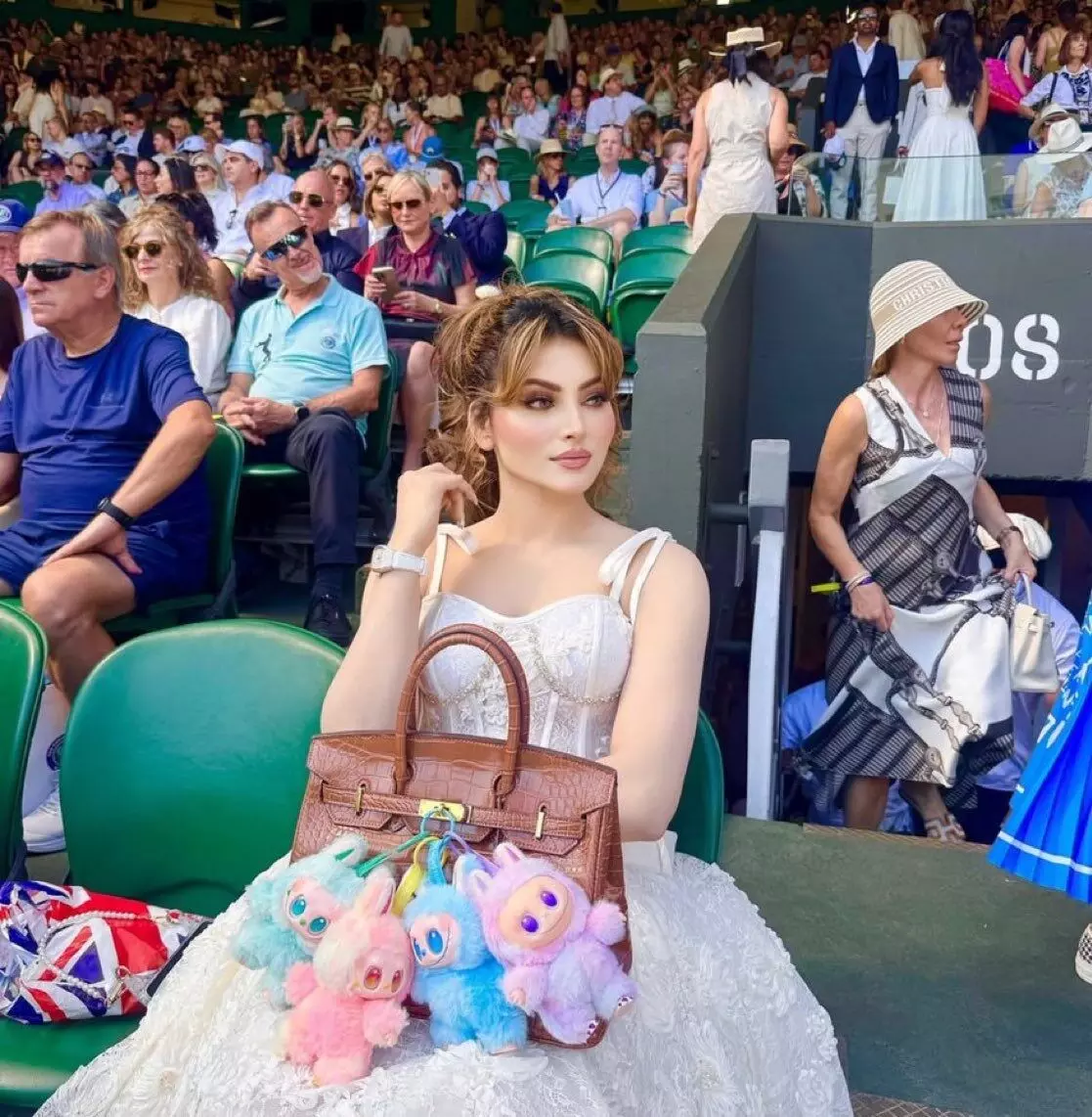 कुछ दिन पहले ही उर्वशी रौतेला विंबलडन विमेन्स सिंगल्स फाइनल में शामिल हुई थीं। उन्होंने आइवरी कलर की मिडी ड्रेस पहनी थी, जिसमें कॉर्सेटेड बोडिस डिज़ाइन था। हालांकि, सबसे ज्यादा ध्यान उनके Hermès हैंडबैग ने खींचा जिसपर चार रंग-बिरंगे लबूबू डॉल्स सजाए हुए थे।