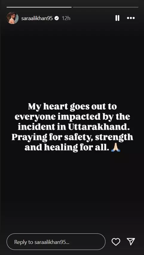 अभिनेत्री सारा अली खान इस हादसे से आहत हुई हैं। उन्होंने इंस्टाग्राम पर लिखा, "उत्तराखंड में हुई इस घटना से बहुत दुखी हूं। मेरी दुआएं सभी प्रभावित लोगों के लिए हैं, उनकी सुरक्षा, शक्ति और जल्द ठीक होने के लिए।"