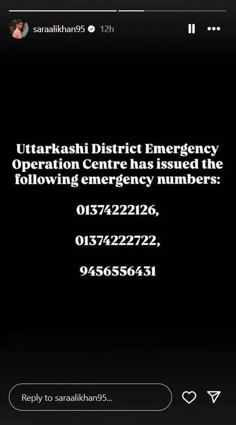 इसी के साथ सारा ने आगे आकर जरूरी आपातकालीन नंबर भी शेयर किए। बताते चलें, सारा अली खान ने अपनी पहली फिल्म केदारनाथ की शूटिंग उत्तराखंड में की थी।