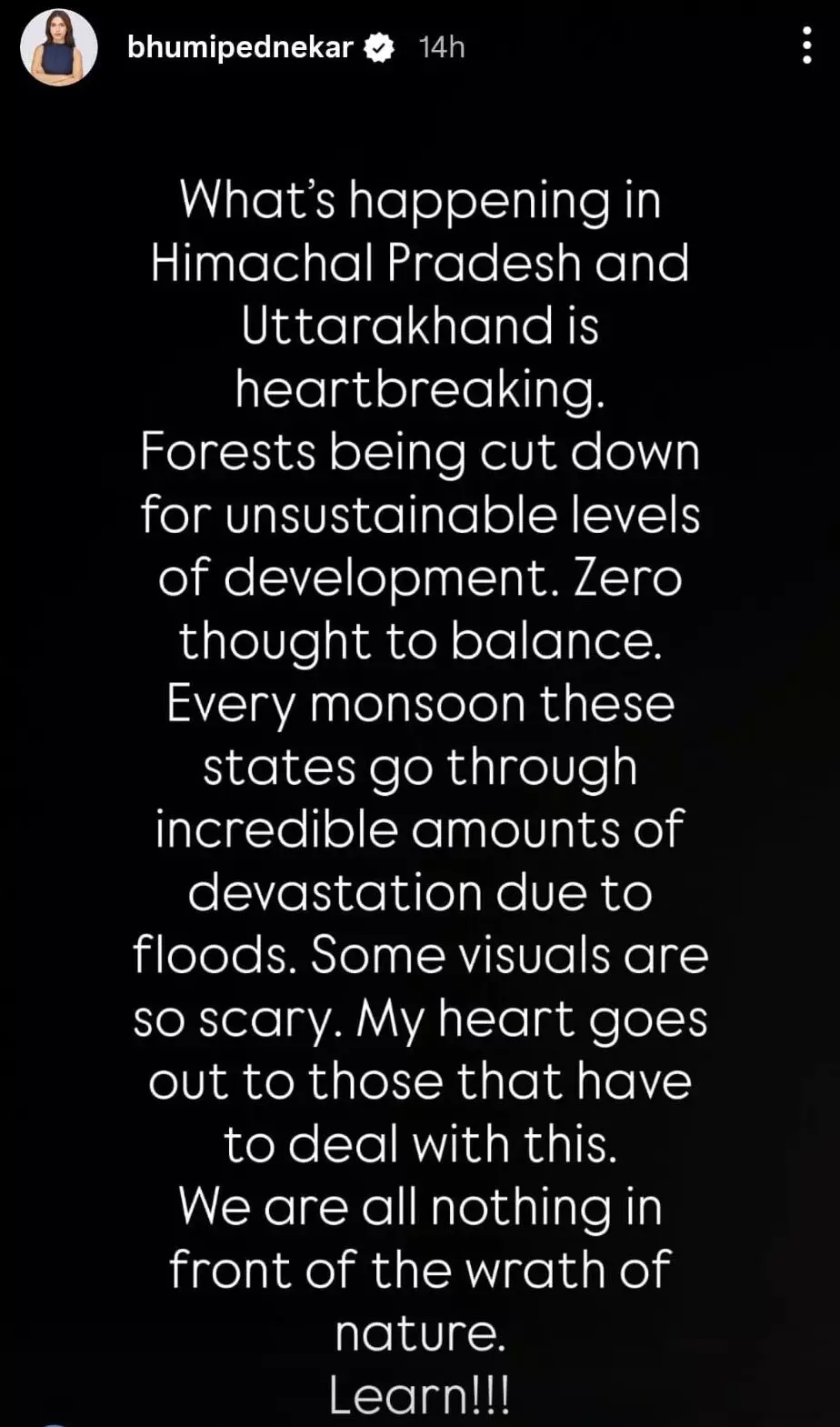 अभिनेत्री भूमि पेडनेकर ने अपने इंस्टाग्राम पर लिखा- "उत्तराखंड और हिमाचल प्रदेश में जो हो रहा है, वह दिल दहला देने वाला है। हमें जलवायु परिवर्तन के प्रभाव को गंभीरता से लेना होगा।"