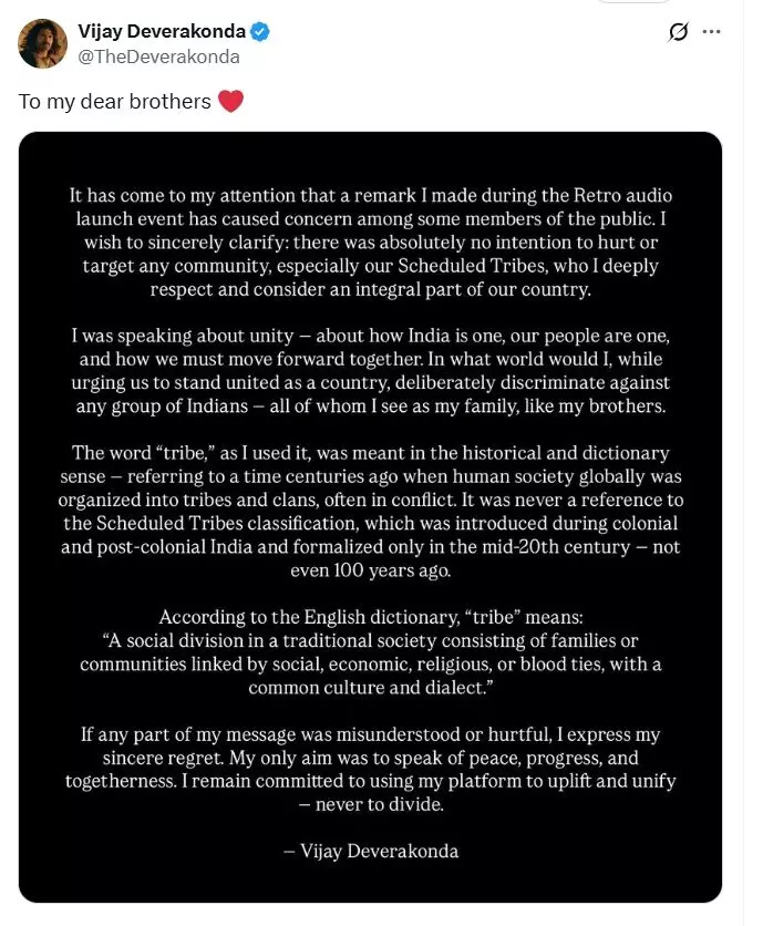 विवाद बढ़ने के बाद विजय देवरकोंडा ने 3 मई को अपने एक्स (पूर्व में ट्विटर) पर बयान जारी करते हुए माफी मांगी। उन्होंने लिखा, ''मेरी किसी भी टिप्पणी से किसी समुदाय को ठेस पहुंचाना मेरा इरादा कभी नहीं था, विशेषकर हमारे आदिवासी भाइयों-बहनों को, जिनका मैं सम्मान करता हूं।''
