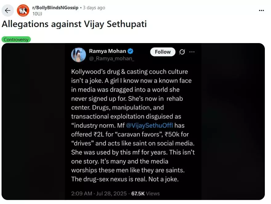 दरअसल, राम्या मोहन नाम की एक महिला ने सोशल मीडिया पर विजय सेतुपति पर गंभीर आरोप लगाए थे। हालांकि बाद में उनका अकाउंट डिलीट कर दिया गया। पोस्ट में उन्होंने लिखा था कि एक महिला को फिल्म इंडस्ट्री की आड़ में मानसिक और शारीरिक शोषण का शिकार बनाया गया।