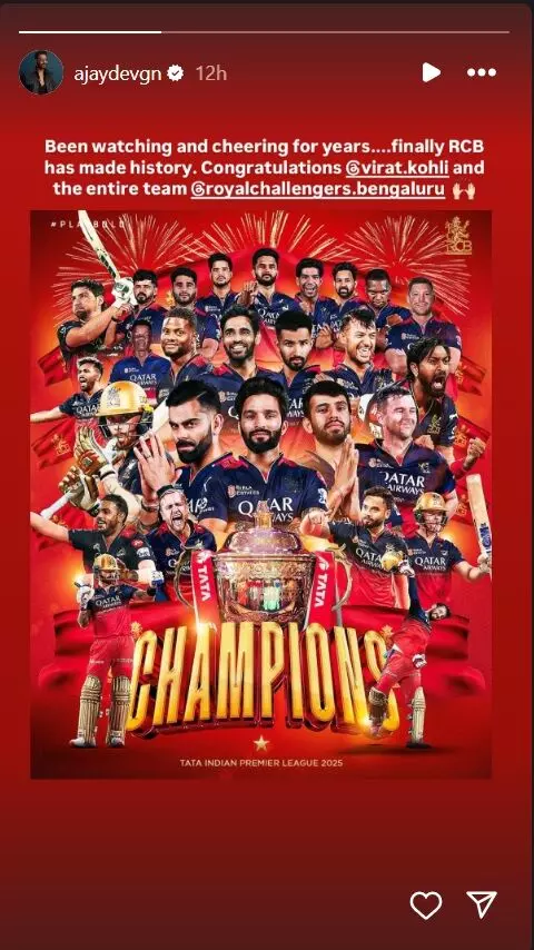 अभिनेता अजय देवगन ने इंस्टाग्राम स्टोरी पर RCB का पोस्टर शेयर करते हुए लिखा, "सालों से देख रहे थे और चीयर कर रहे थे... आखिरकार RCB ने इतिहास रच दिया। बधाई हो विराट कोहली और पूरी टीम को।"