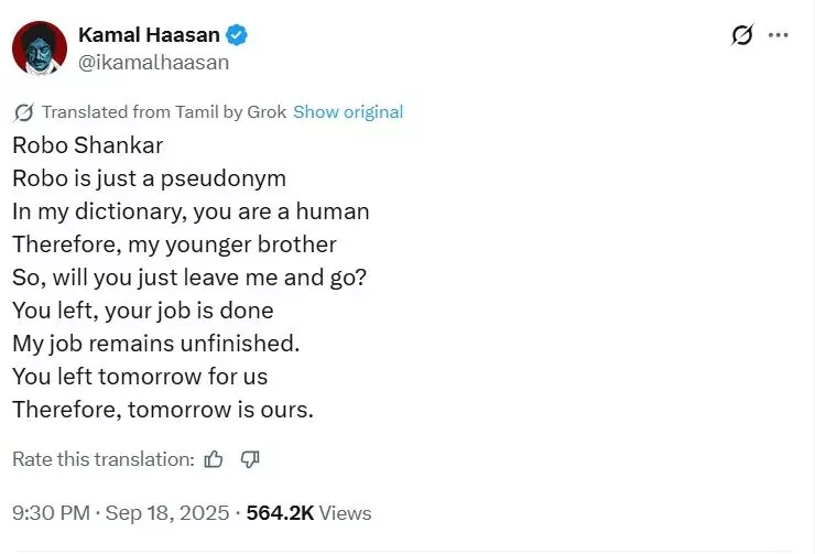 रोबो शंकर के निधन से साउथ इंडस्ट्री में शोक है। अभिनेता कमल हासन ने रोबो शंकर के निधन पर x पर एक भावुक पोस्ट लिखा।