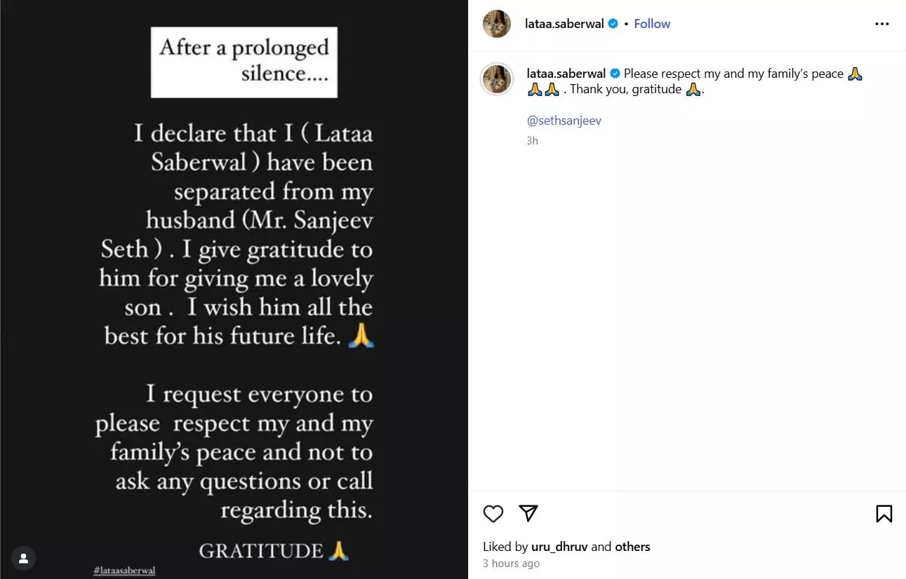 अपनी पोस्ट में लता ने लिखा- "एक लंबे समय की चुप्पी के बाद... मैं (लता सभरवाल) यह घोषणा करती हूं कि मैं अपने पति (श्री संजीव सेठ) से अलग हो चुकी हूं। मैं उन्हें हमारे बेटे के लिए धन्यवाद देती हूं और उनके भविष्य के लिए शुभकामनाएं देती हूं। कृपया मेरी और मेरे परिवार की शांति बनाए रखने के लिए किसी भी तरह का सवाल या कॉल न करें। धन्यवाद।"